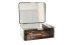 ヒュミドールの着色された壁は、あなたの葉巻を控えめに見ることを可能にし、**シルバーのマグネットクラスプは**全体的なイメージを調和させます。この留め具により、内部の気候が最適に保たれます。ヒュミドールの**右側にはシルバーの蝶番が**あり、さらにスタイリッシュなディテールとなっています。
