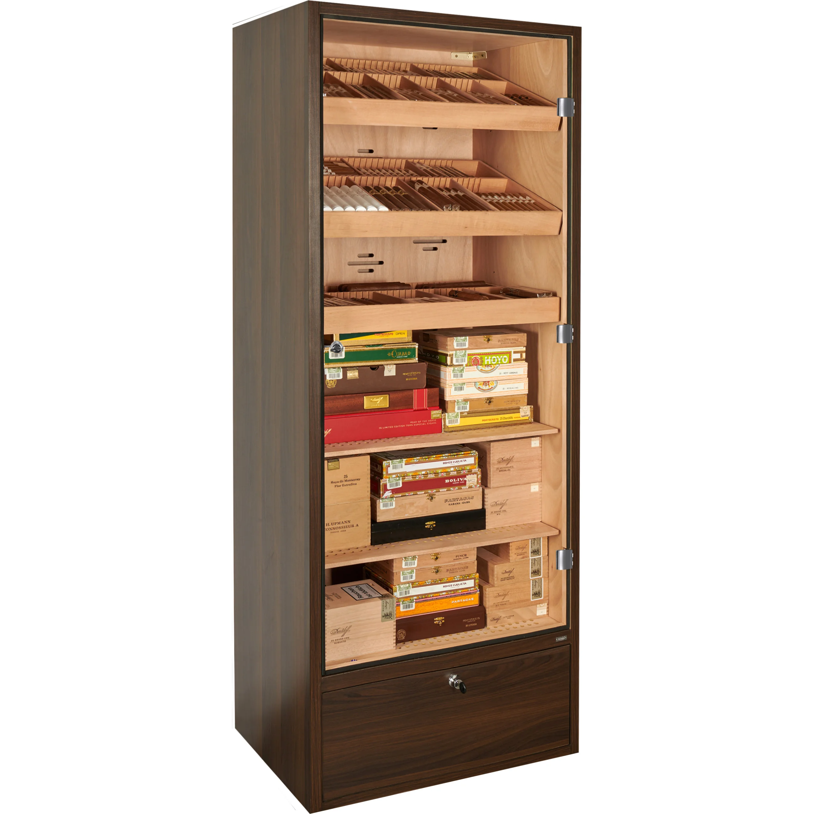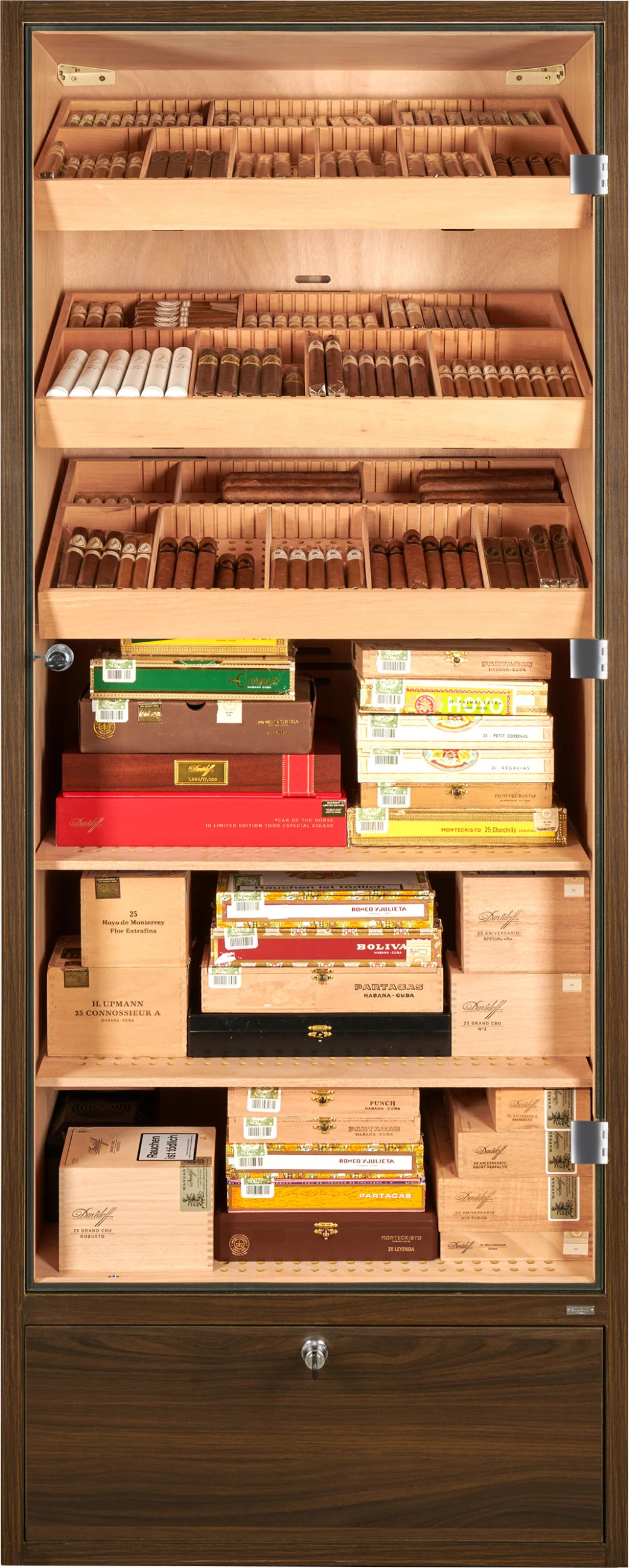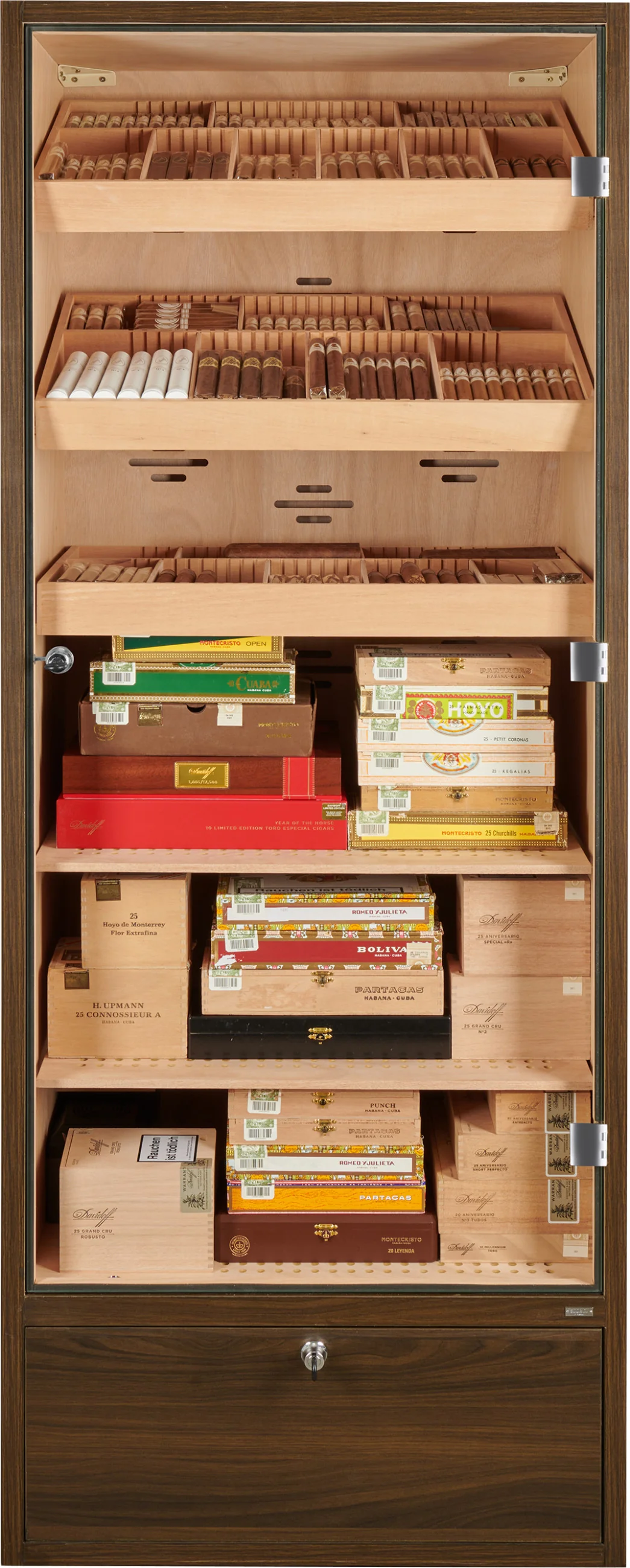 The humidor cabinet offers space for approximately 2800 cigars, calculated based on the classic Mareva format. Storage is designed for both individual cigars and entire boxes. The interior is divided into six levels and equipped with three trays and two shelves.