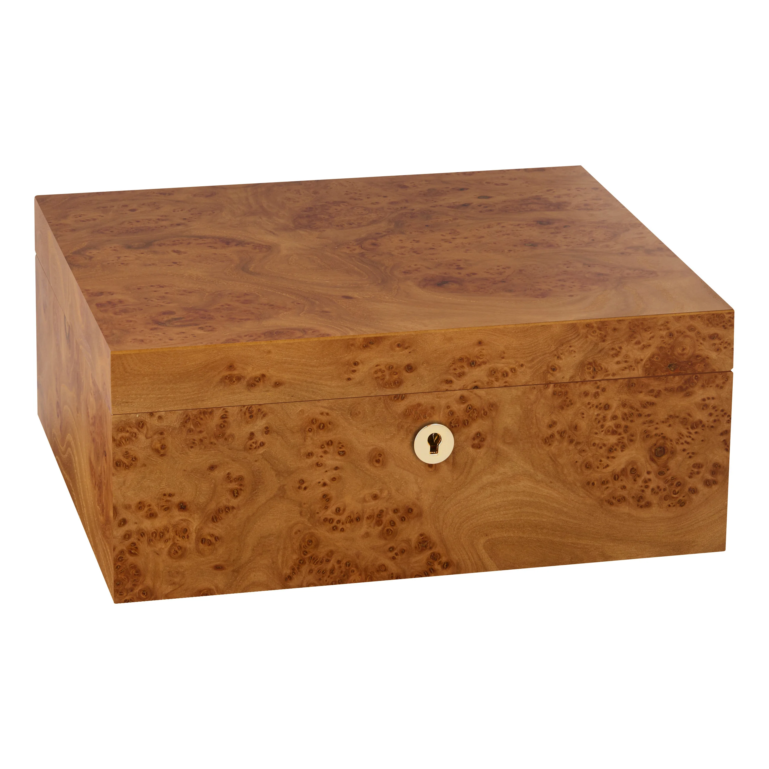 The elm wood impresses with its characteristic grain with warm to dark brown tones, interspersed with striking burrs, also known as "eyes." Thanks to its warm and natural appearance, the humidor blends harmoniously into almost any setting. Medium-sized humidors hold up to 75 cigars, providing ample space for your cigar collection.