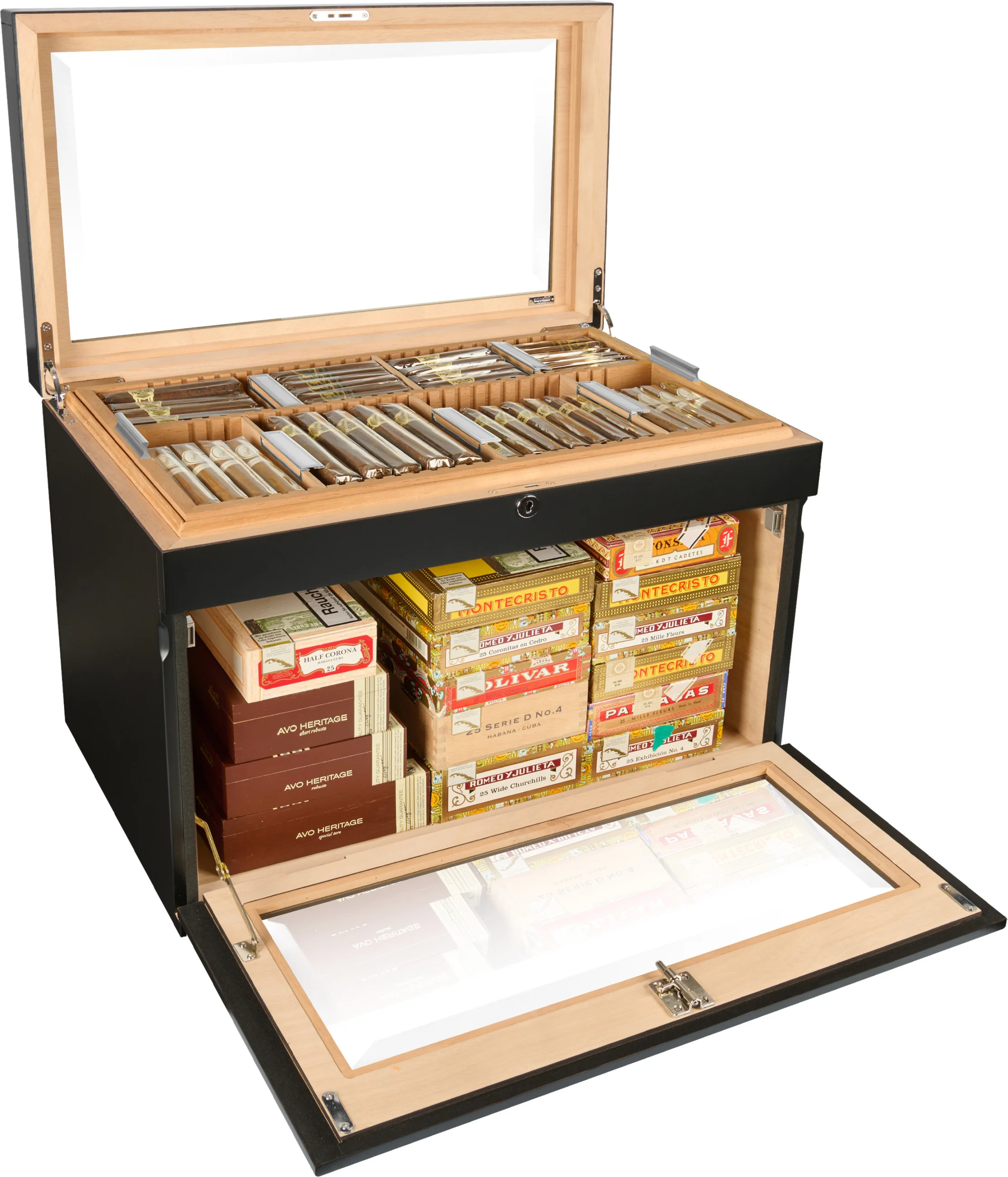 Multiple levels allow for the storage of individual cigars, boxes, or even entire cigar cases. The interior can be divided in various ways: