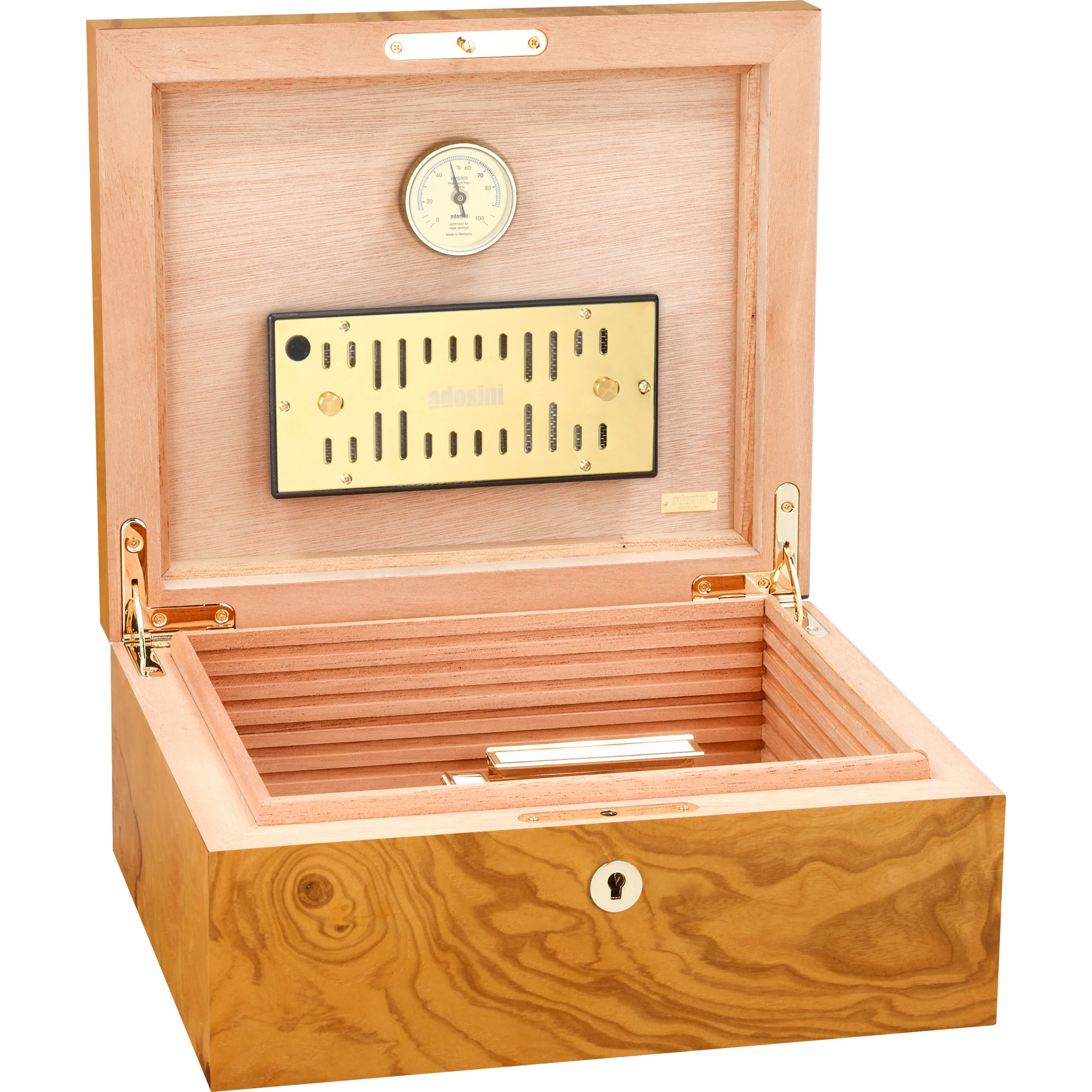 The horizontal and vertical dividers and the label clips allow for even more stylish organization and partitioning of the interior. Adorned with gold elements such as the lock and hinges, the interior presents a harmonious overall impression in combination with the olive wood veneer.