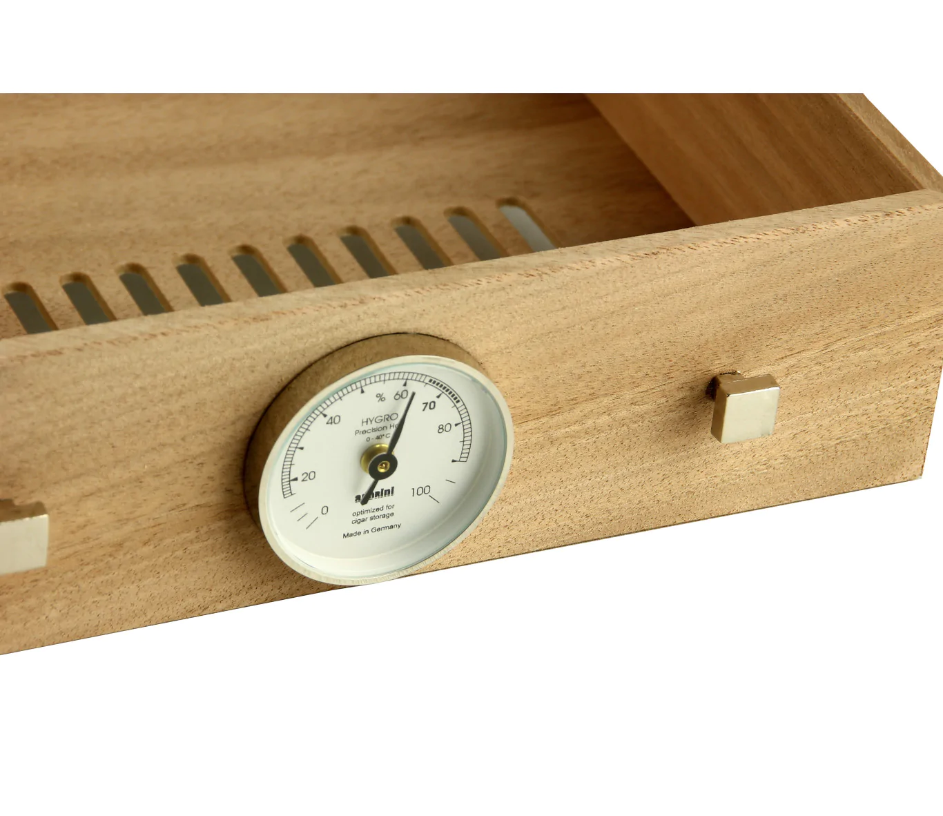 - 湿度計用ホール:引き出しには湿度計用のホールがあり(湿度計は付属していません)、ヒュミドール内の湿度レベルを簡単に把握することができます。