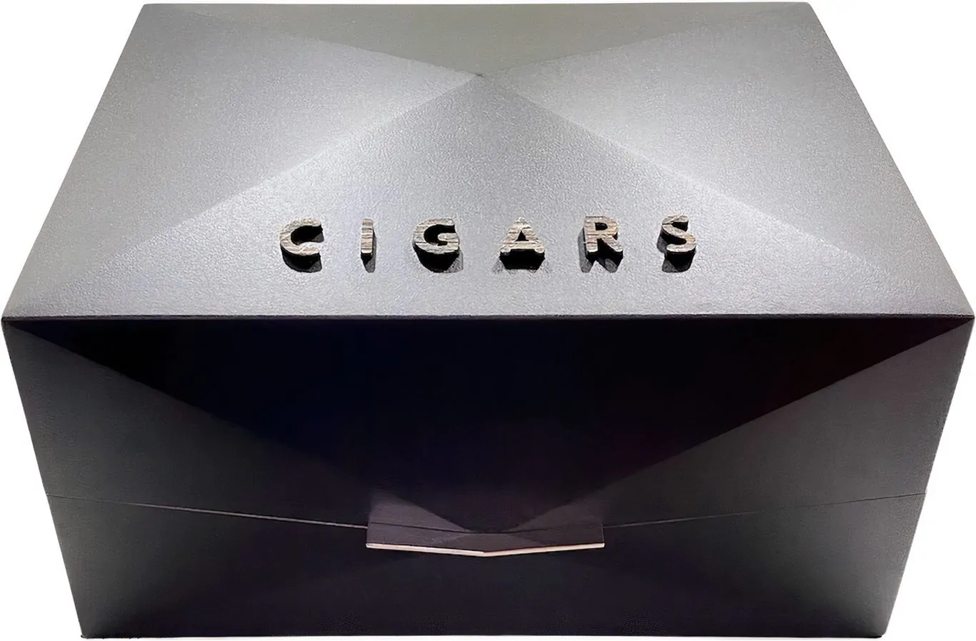 - ヒュミドールを飾る本物の木のインターシャと「Cigars」の文字。