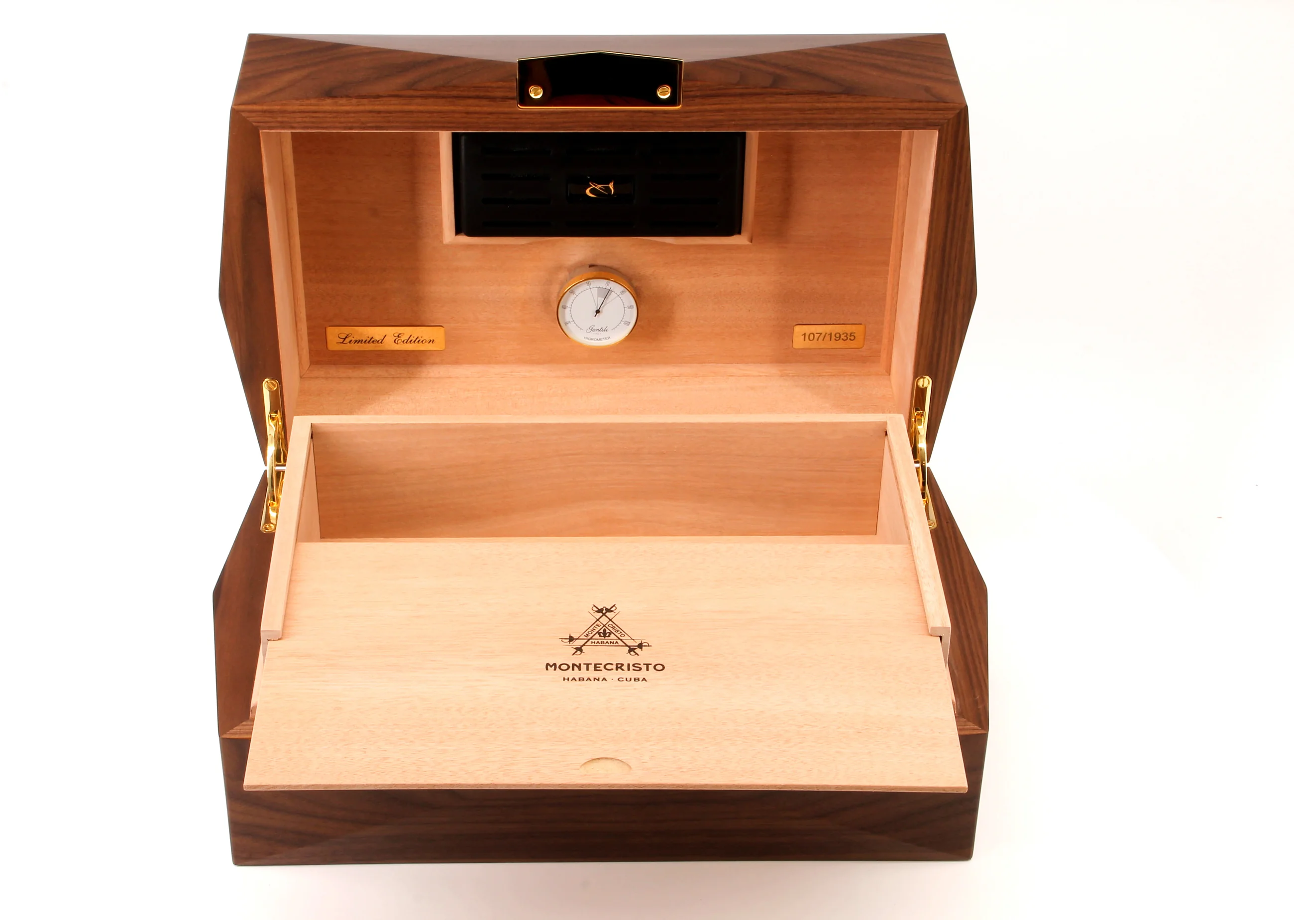 ヒュミドール内部にはすばらしい宝物がたくさんあるので、きっとあなたは笑顔になるでしょう。取り外し可能なスライドトップシダーボックスは、ヒュミドール内側にぴったりと収まり、貴重なモンテクリストの葉巻を収納するのに最適なスペースを作っています。加湿器とクラシックなアナログ湿度計により、コロナサイズ葉巻 最大75本をしっかりと湿度制御します。限定1935個のヒュミドールには、ひとつずつエディション番号が付けられています。
