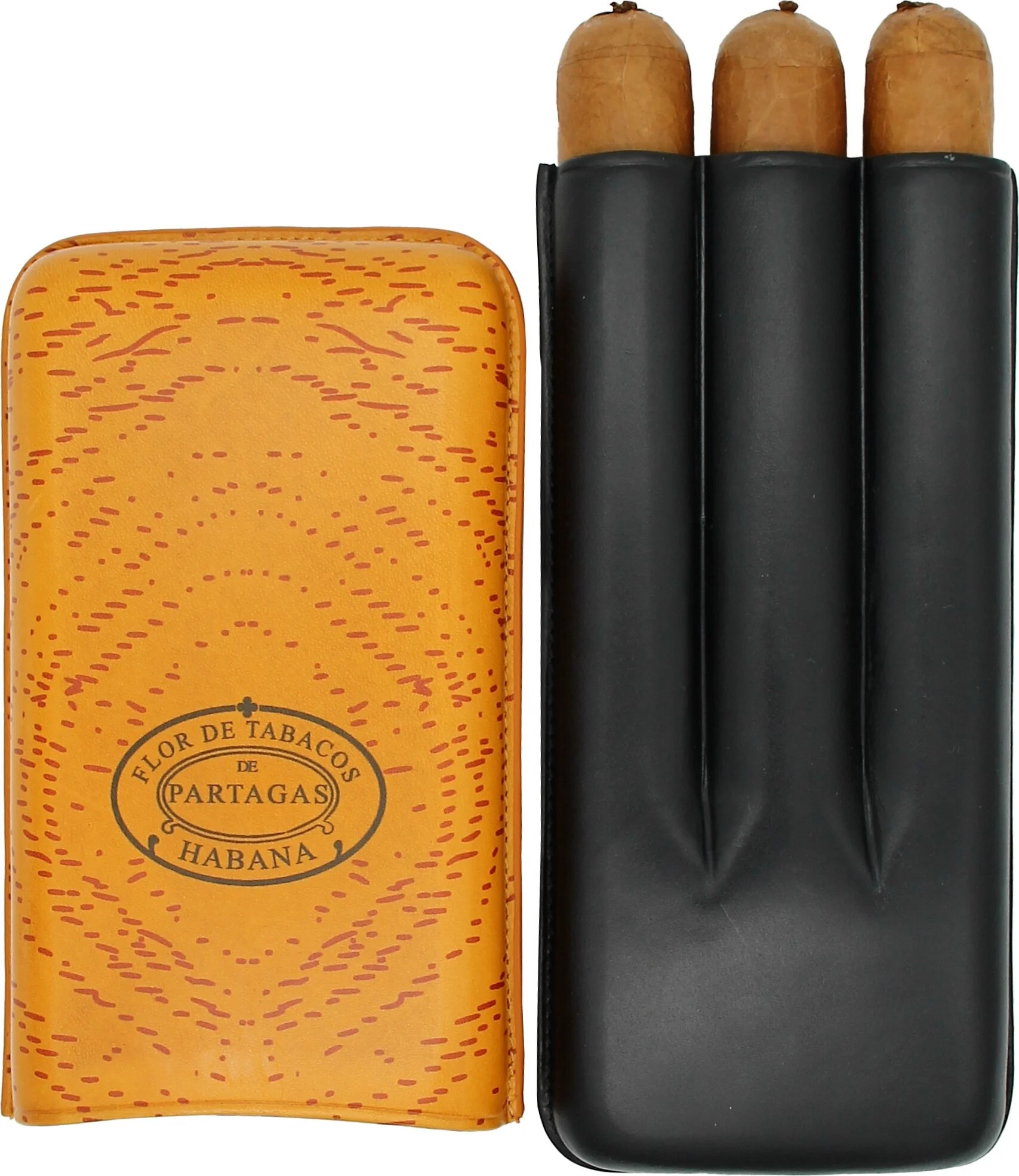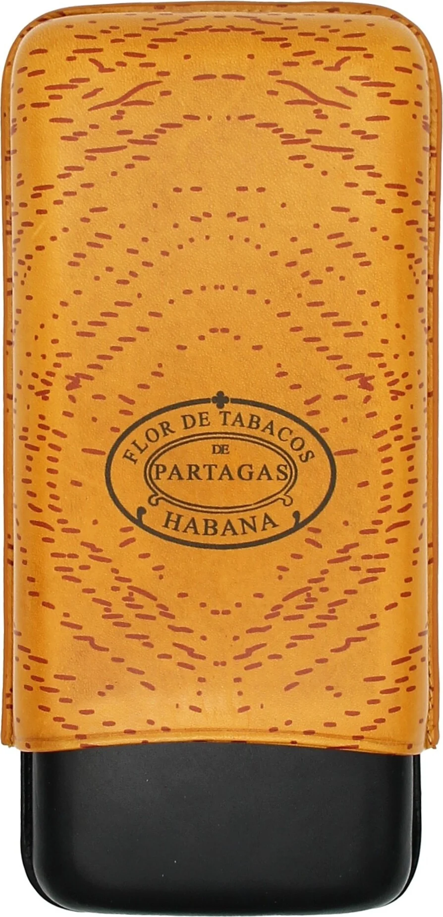 The Partagas Classic Leather Cigar Case in striking orange and black is a luxurious accessory from the Cuban cigar brand Partagas. The finely smooth leather surface in classic Partagas orange conveys an authentic look. The brand logo, unmistakably representing Partagas, is prominently displayed on the front, giving the case an exclusive appearance.