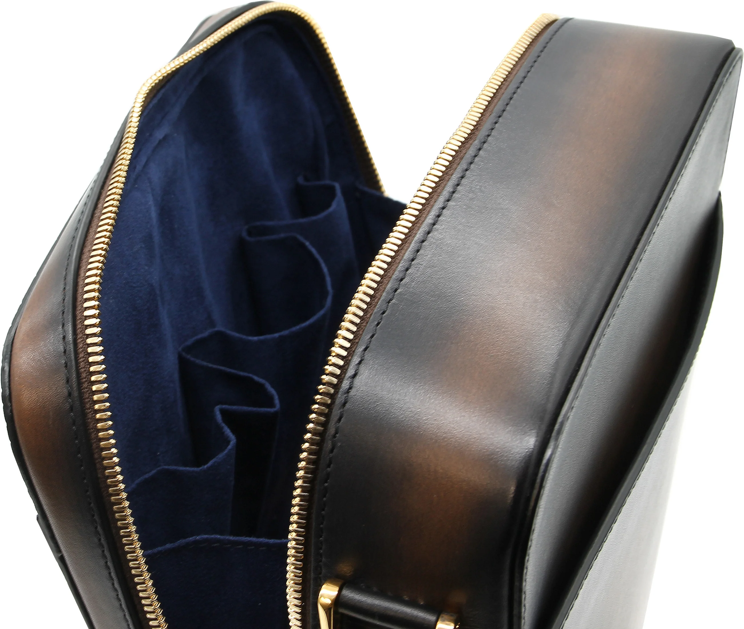 バッグ内部には、ライターやカッターなどの葉巻用アクセサリーを収納できる独立したコンパートメントと、特別なクレジットカード用コンパートメントがあります。この区分けにより、すべての重要な道具が安全に整然と収納されます。サイズは25 x 20.5 x 7.5cmで、身の回り品やシガーアクセサリーを収納するのに十分なスペースがあります。