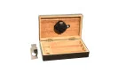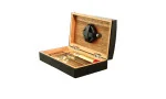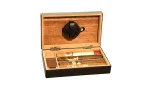 - もう一つのコンパートメントには、高品質の**ステンレス製ギロチン式シガーカッターが**収納されており、マグネットで固定されます。この革新的なソリューションは、輸送中の破損から葉巻を守ります。