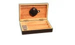 ヒュミドールは簡単に開けることができ、**杉材で**裏打ちされた美しい内部が現れます。シルバーの蝶番がエレガントなデザインを継続し、蓋のクロームエレメントと調和しています。よく考えられたスタイリッシュなソリューションが、蓋に一体化された丸い加湿器で、スナップ留めの革ひもでしっかりと固定されています。蒸留水で満たされたこの加湿器は、外出先でも自宅でも葉巻を完璧に保管します。